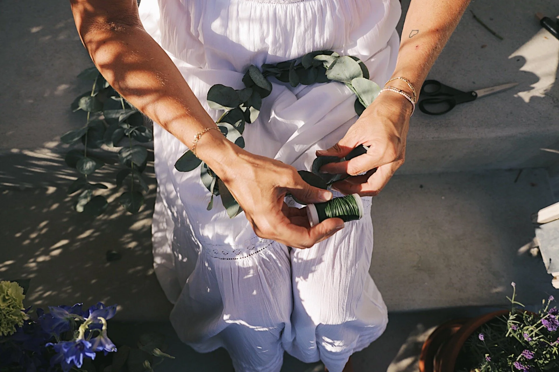Grønne blader dekker godt og egner seg fint til den første runden, for eksempel eukalyptus eller eføy. Fest vikletråden og start med å legge grenene rundt ståltråden. Snurr vikletråden rundt etter hvert som du legger på flere grener. Sørg for at de sitter godt, men la bladene ligge fritt.